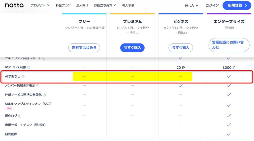 これは「AI学習」とは異なる「サービス改善目的での解析」であり、プランページの「AI学習なし」と矛盾するものではないと考えられますが、気になる場合は契約前に同社に確認しておくと安心です。