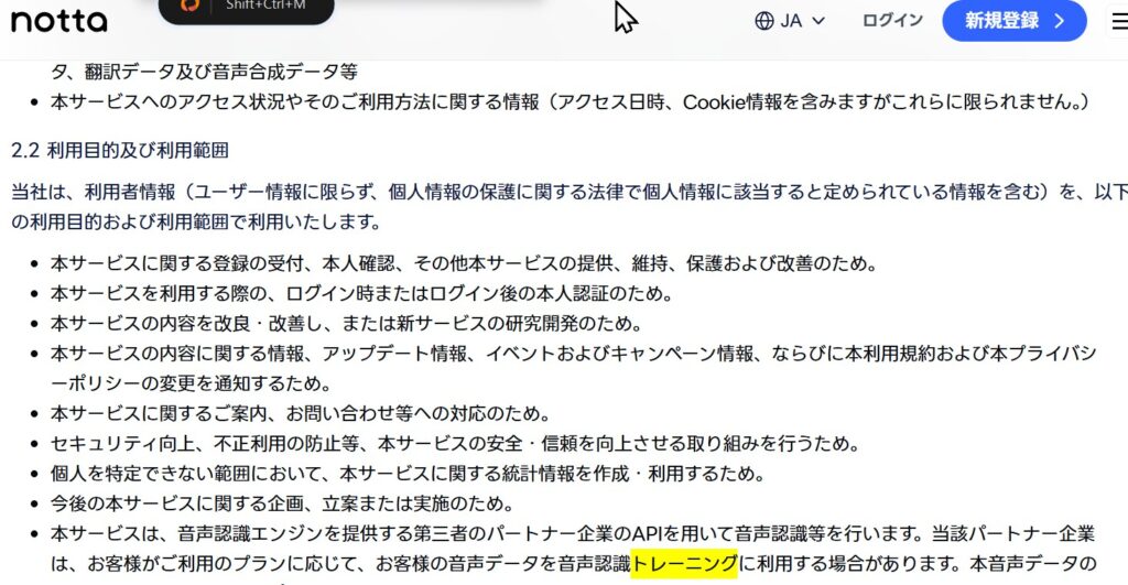 Nottaは日本でも広く使われている文字起こしサービスですが、プライバシーポリシーをよく読むと、無料プランおよびプレミアムプランでは音声データが学習に使用される可能性があります。