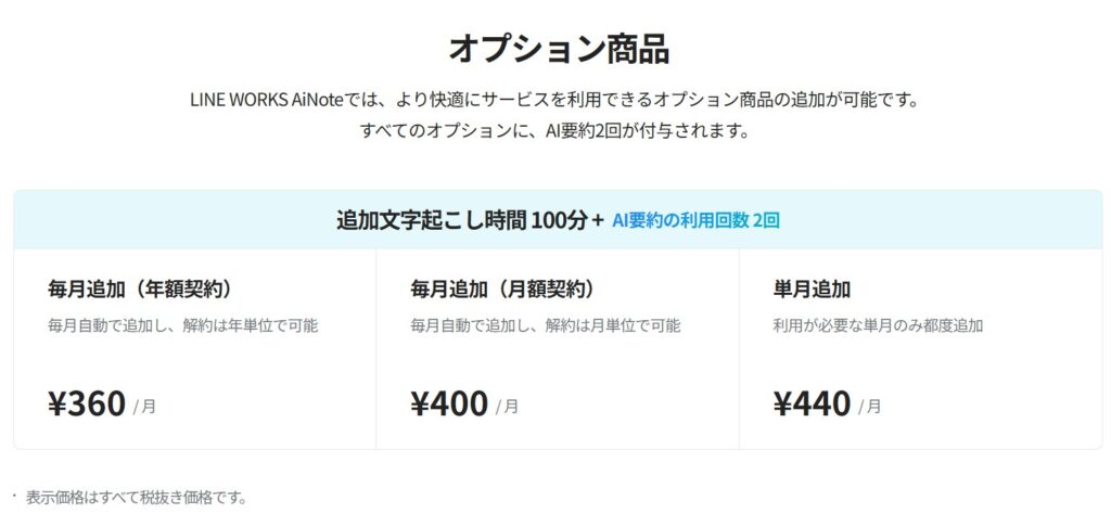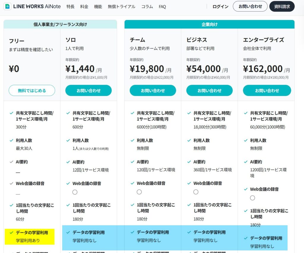 | LINE Works AiNote | ソロ(月払い) | 1,440円 | 600分(10時間) | フリープランは学習利用の可能性あり |