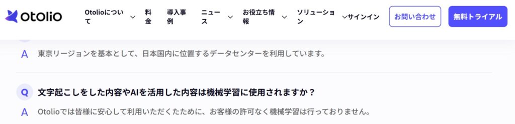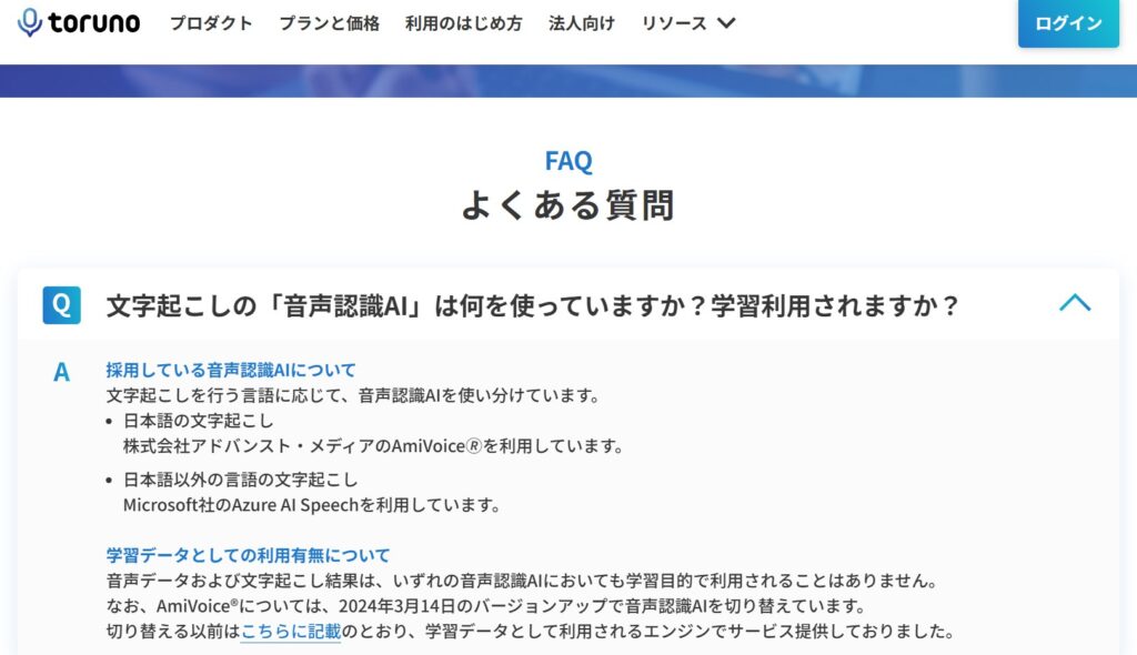 株式会社リコーが提供するtorunoは、音声データ・文字起こし結果がAI学習に利用されないことを明示しています。