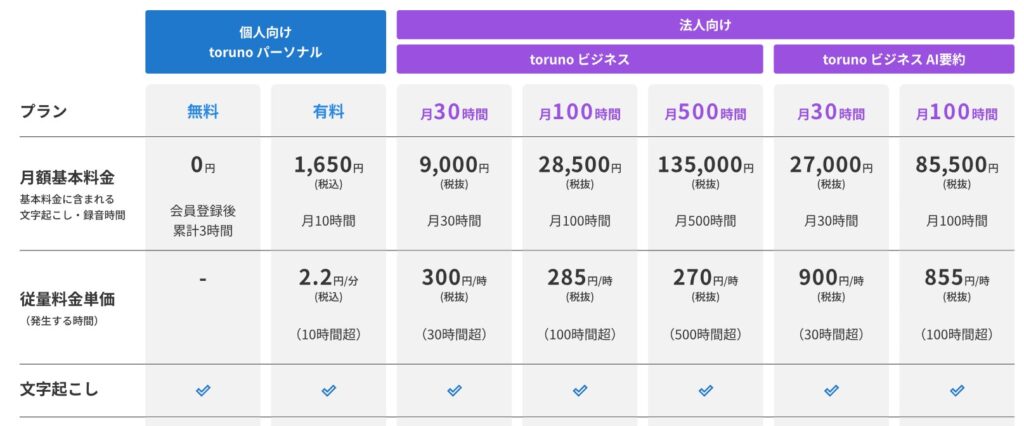 | toruno(リコー) | パーソナル(有料) | 1,650円 | 600分(10時間) | 超過分は2.2円/分の従量課金 |
