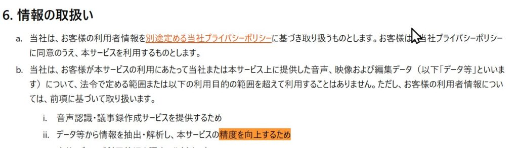 一方で、利用規約には「データ等から情報を抽出・解析し、本サービスの精度を向上するため」に音声・映像・編集データを利用できる旨が記載されています。