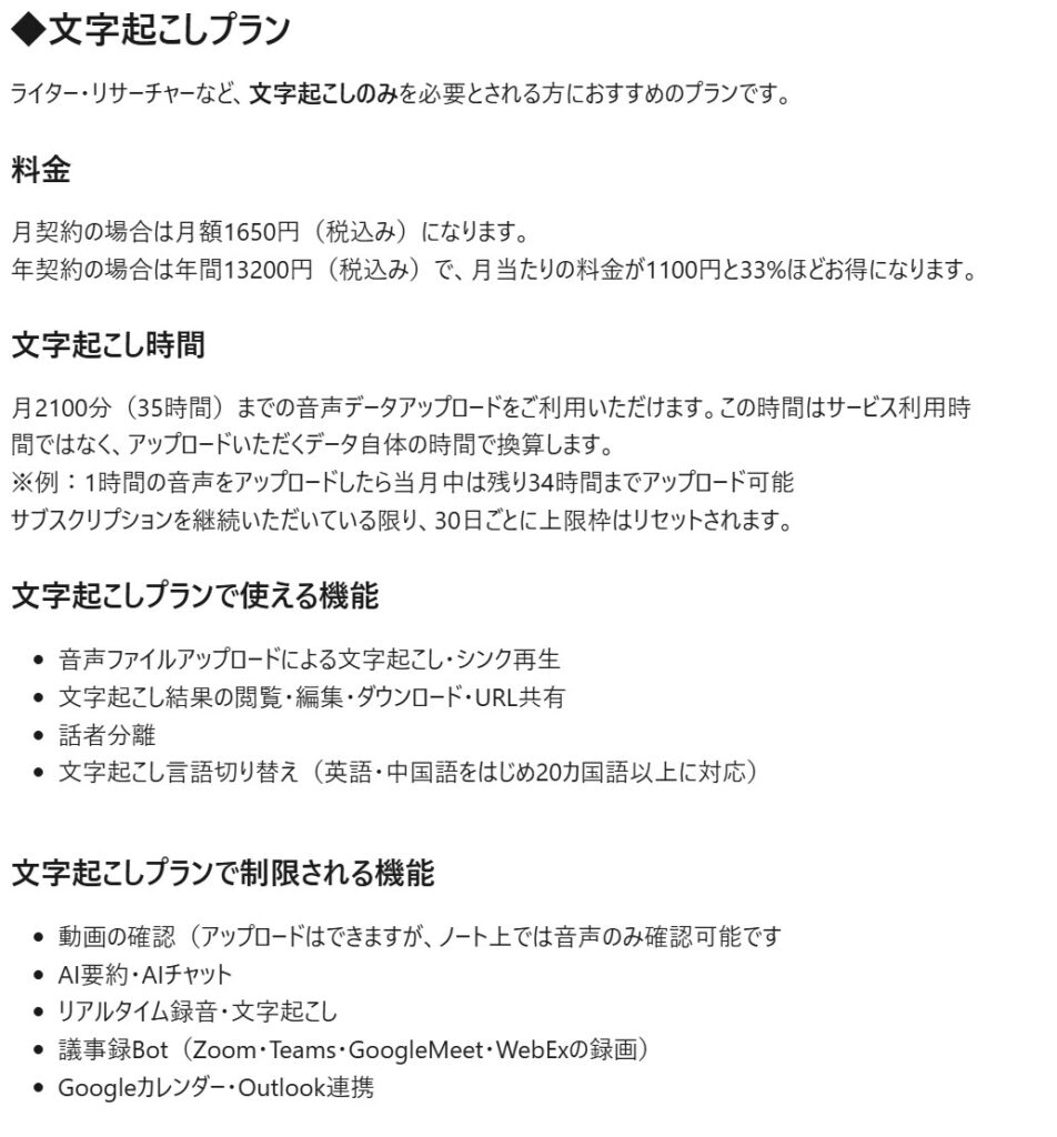 料金は、機能が最もシンプルな「文字起こしプラン」で月額1,650円。詳細説明によると