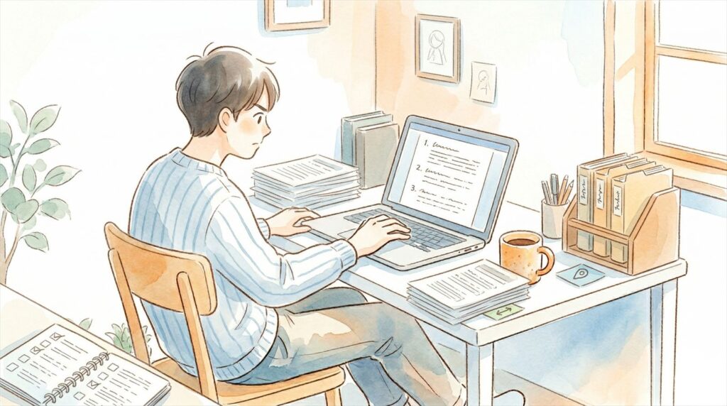 レベル2から大きく変わるのは、構成の指定と情報源の品質コントロールです。Deep Researchは指示がなければ自分で構成を決めますが、記事の構成案がすでにあるなら「この流れで素材を集めてほしい」と伝えたほうが、そのまま執筆素材に使えます。