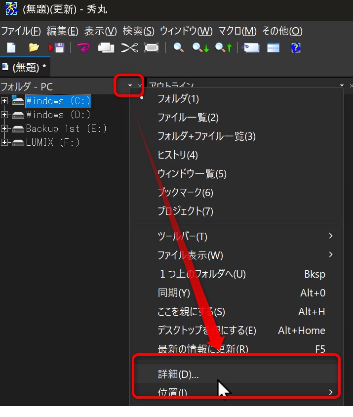 ファイルマネージャ枠の右上にある「▼」マーク→「詳細」をクリック