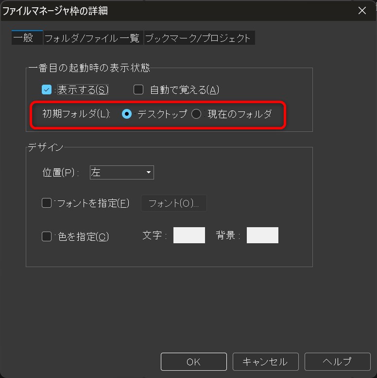 これで次回以降、起動と同時にファイルマネージャ枠が表示されます。同じ画面で初期フォルダの指定もできるので、よく使う作業フォルダをセットしておくと便利です。