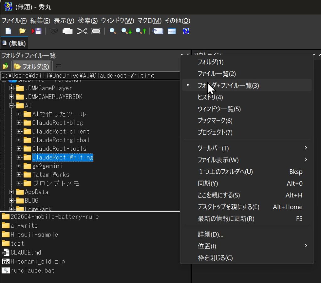 秀丸の中で完結するので、Alt+Tabやタスクバーへの寄り道がなくなります。視線も手も、エディタの中に居続けたまま次のファイルに移れる。これが想像以上に集中の途切れを防いでくれます。