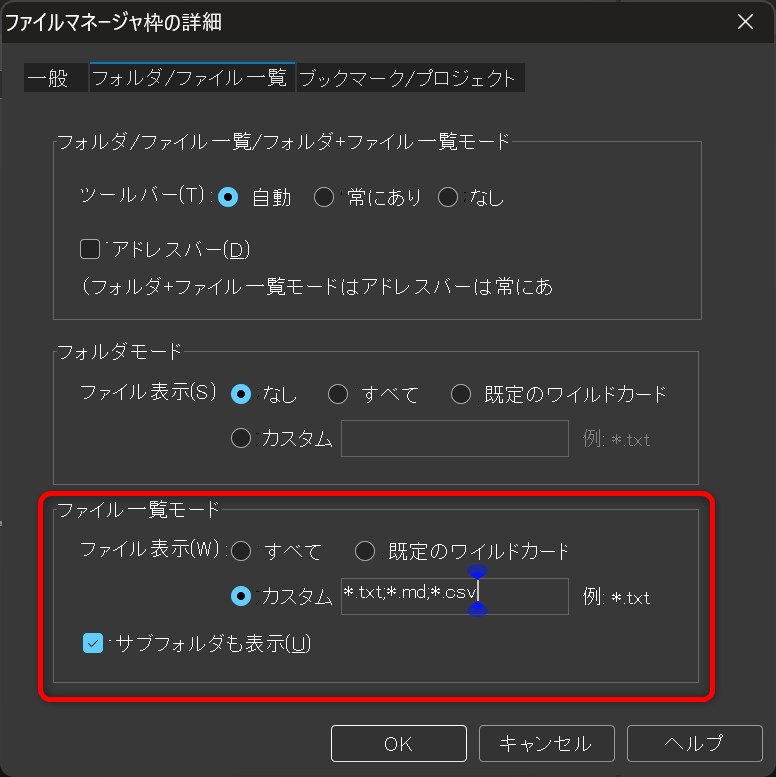 「詳細」→「フォルダ/ファイル一覧」タブで、ファイル一覧モードを「カスタム」にして、